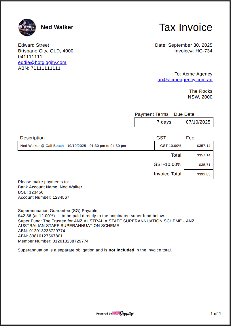 Hot Giggity calculates and tracks SG on eligible bookings so that the payer can remit correctly. If a booking involves a sole trader, we’ll show the SG amount during booking and on the invoice, and we’ll prompt for missing fund details before processing (so your super isn’t missed).