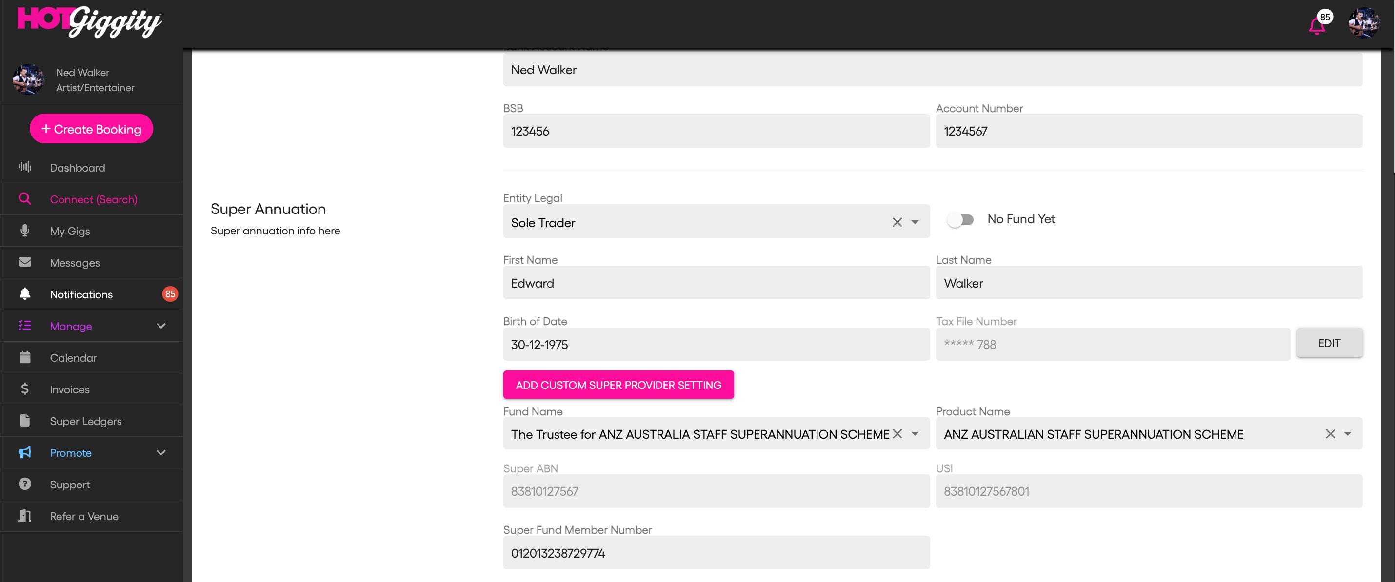 Every sole-trader performer needs their own super fund details saved in Hot Giggity. Super is assessed per person, per booking, based on their entity type and labour-only fee (gear hire and other non-labour items are excluded).