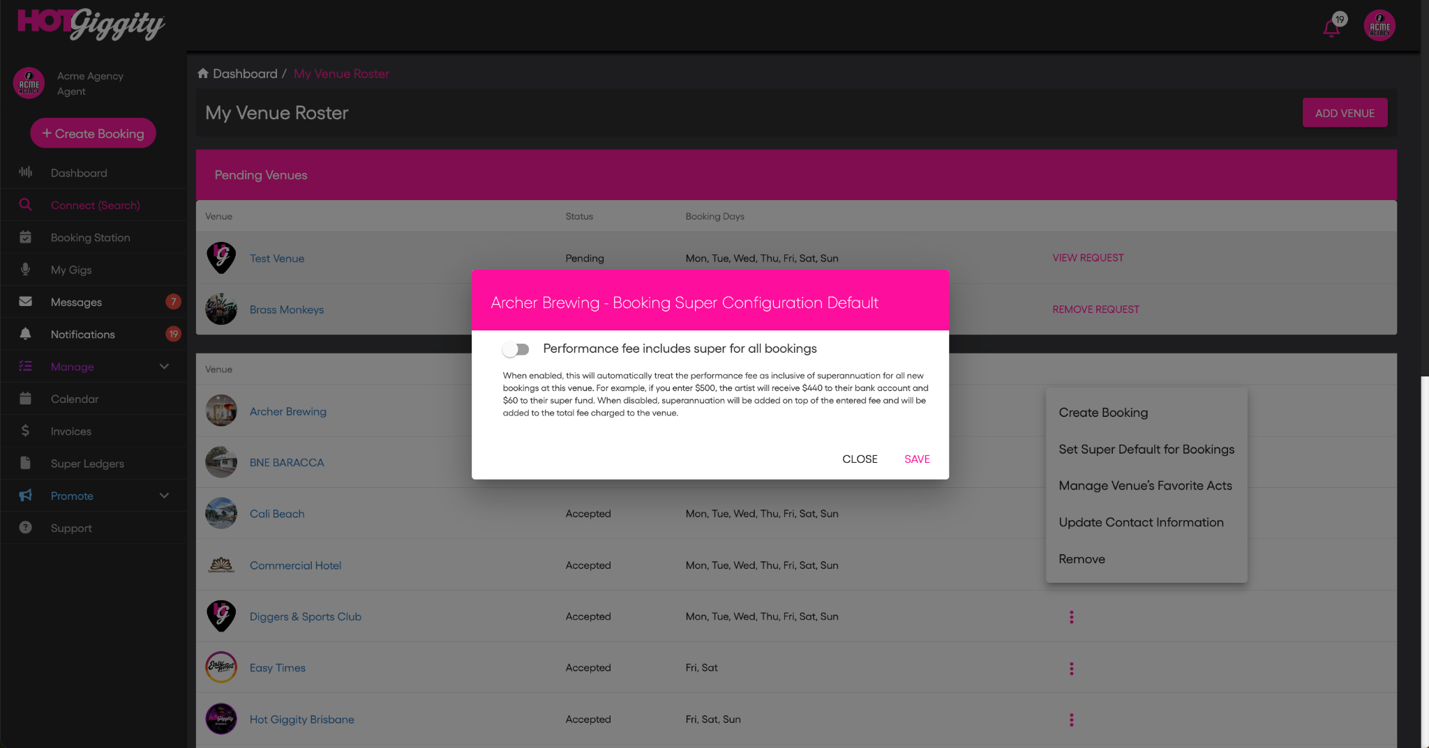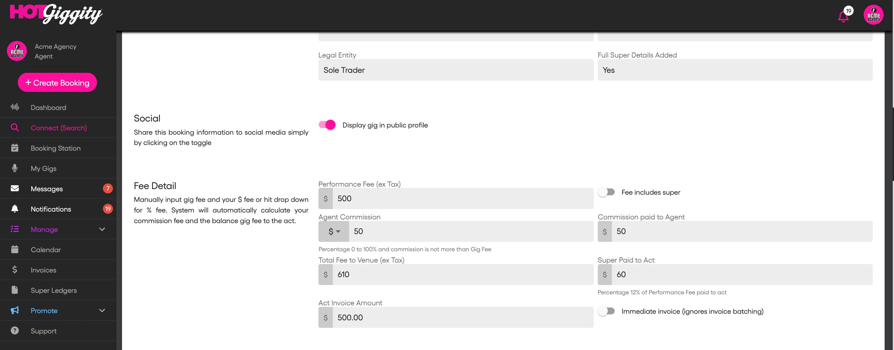When a booking is created for a Sole Trader and triggers Superannuation Guarantee (SG), choose whether the performance fee includes super (embedded) or is plus super (added on top). Hot Giggity supports both via a single toggle on the booking sheet.
