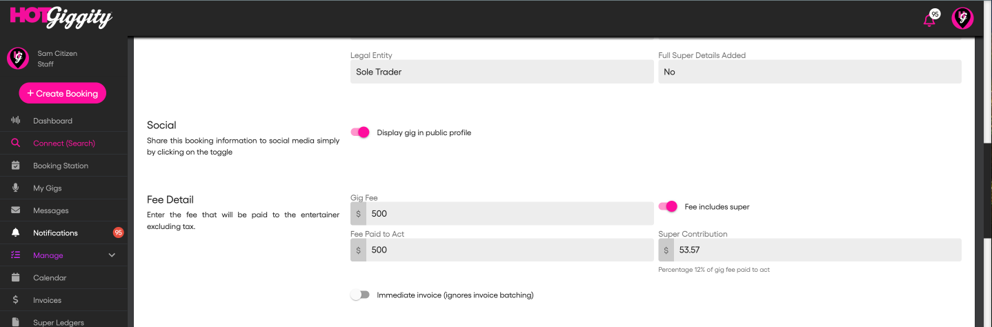 When a booking triggers Superannuation Guarantee (SG), choose whether the performer’s fee includes super (embedded) or is plus super (added on top). In Hot Giggity this is a simple toggle on the booking sheet. Platform default is Fee includes super. SG is currently 12% (from 1 July 2025). Super is not subject to GST.