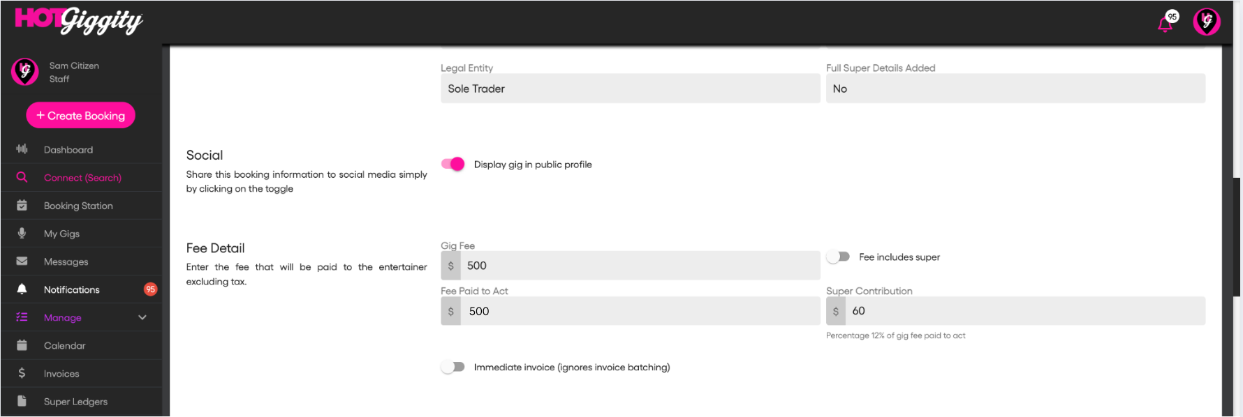 The Gig Fee you enter already contains the required SG. Hot Giggity back-calculates the performer’s bank amount (Fee Paid to Act) and the Super Contribution so that bank + super = Gig Fee.Fee excludes super (Plus super)