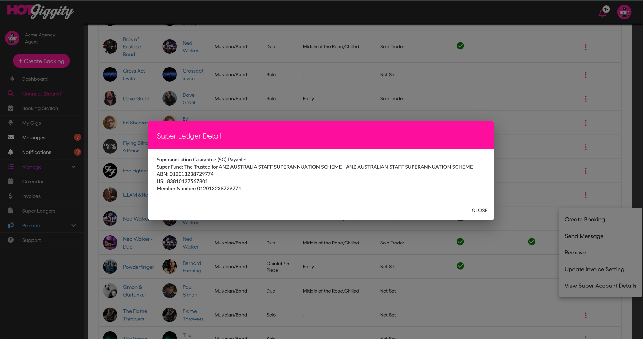 In Manage → My Act Roster → ⋯ → View Super Account Details, or on the SG Payable panel of the artist invoice.