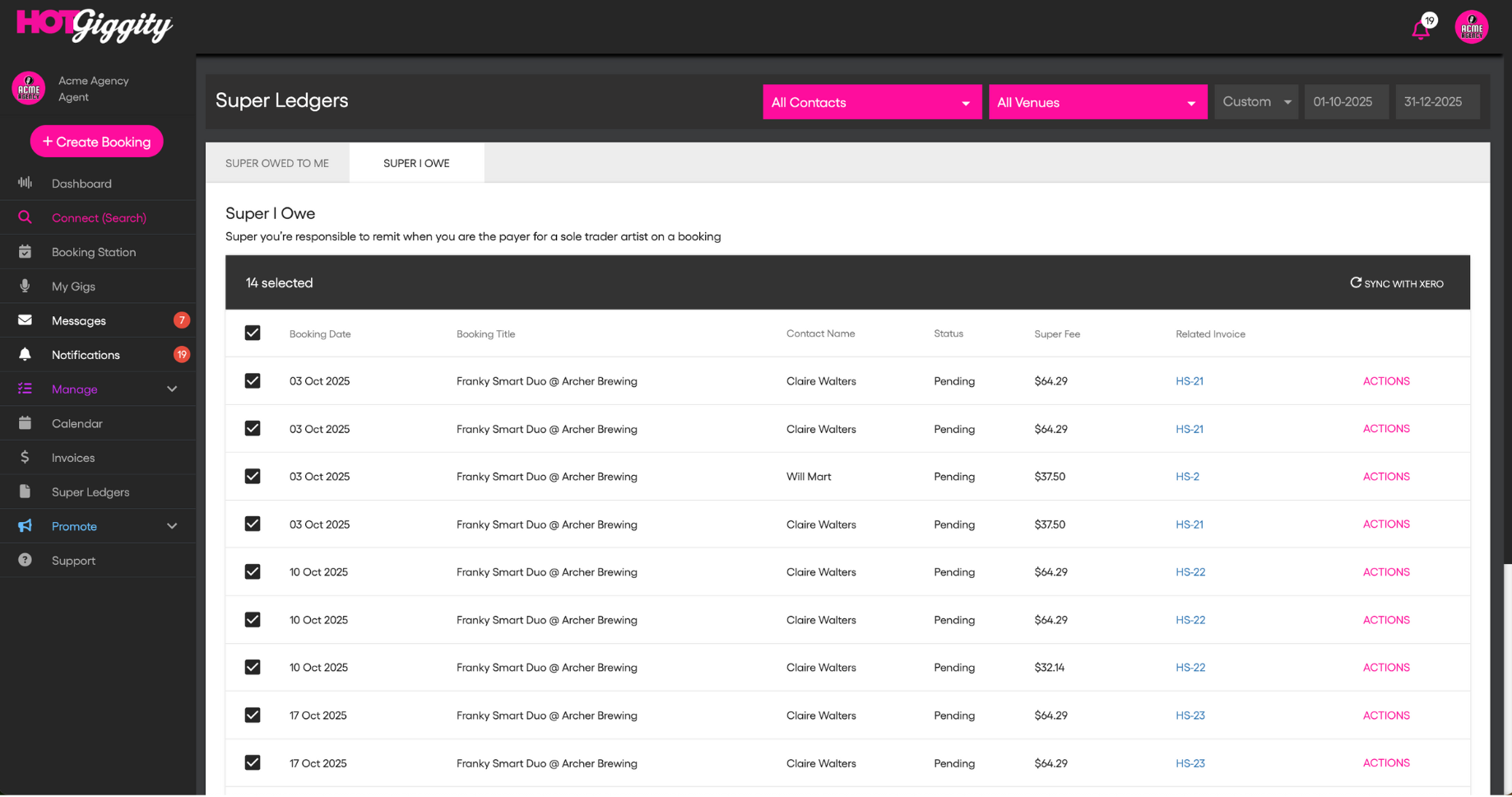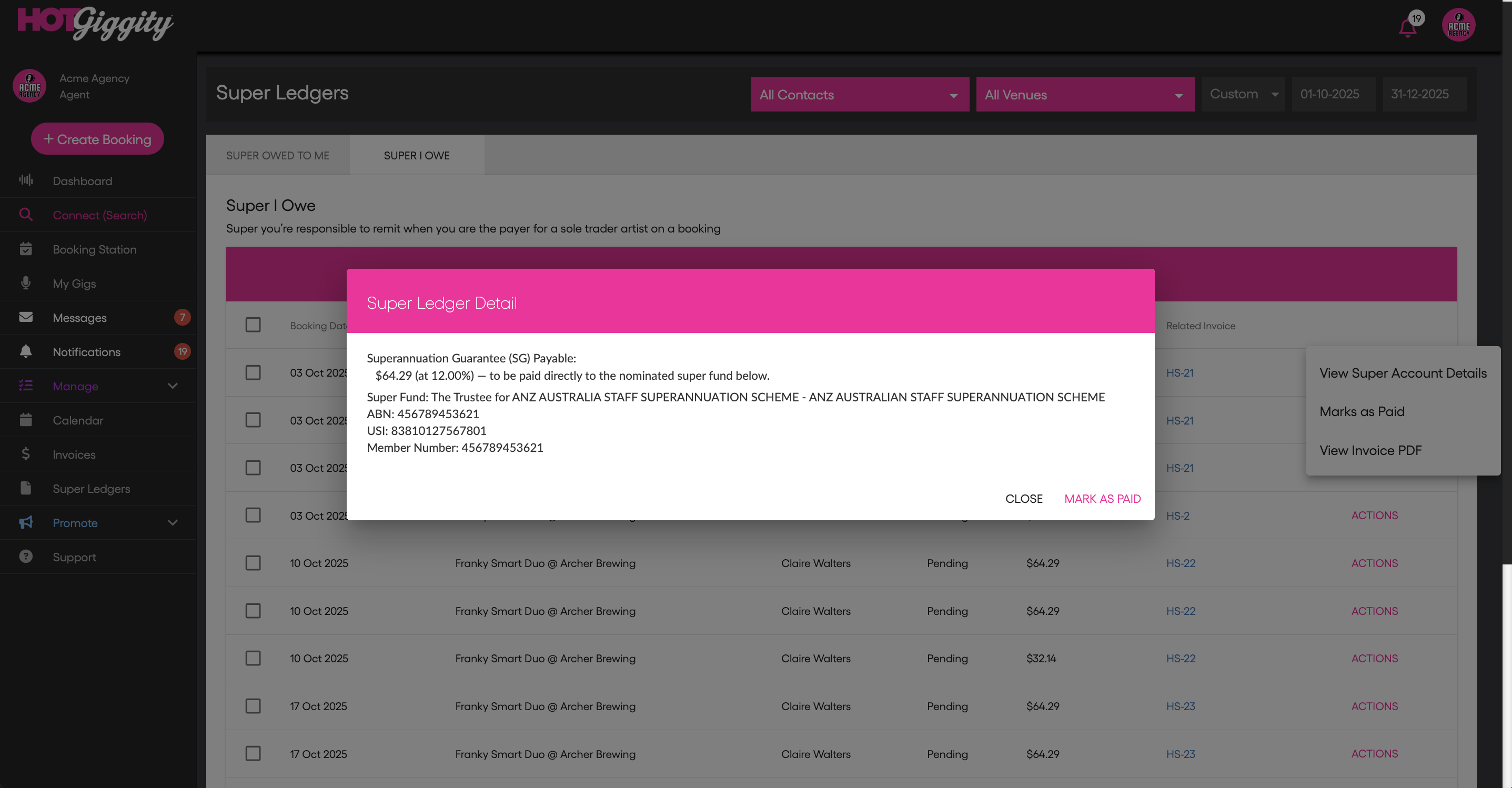 Hot Giggity’s Super Ledgers keep all Superannuation Guarantee (SG) activity in one place so you can see what you owe, what you’ve collected, and what’s paid—per booking, act, and period.