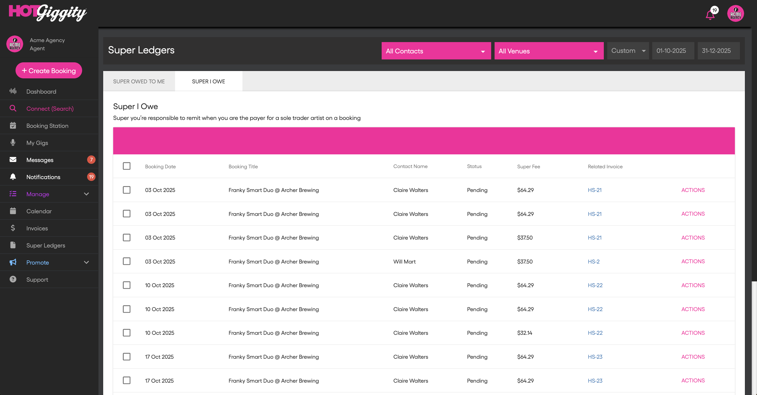 Hot Giggity’s Super Ledgers put all Superannuation Guarantee (SG) activity in one place so you can see what you owe for sole-trader performers, export it, and reconcile quarter-end quickly.