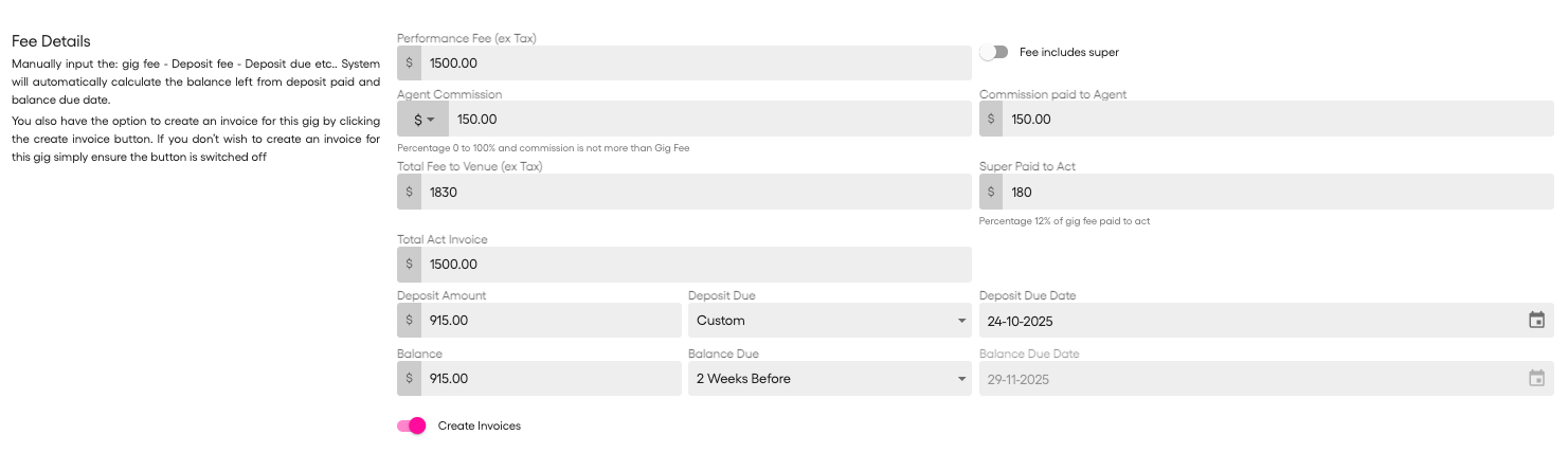 Hot Giggity will calculate the Super paid to Act at the current SG rate and show you the Total to Venue (ex Tax) figure.