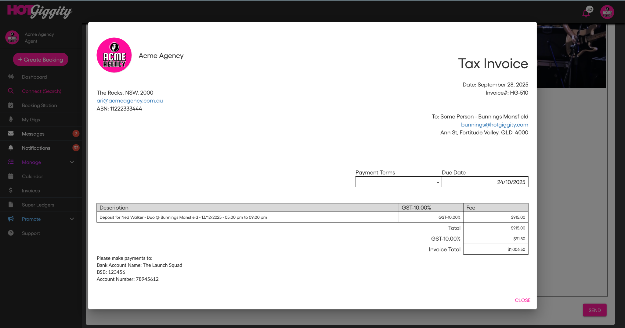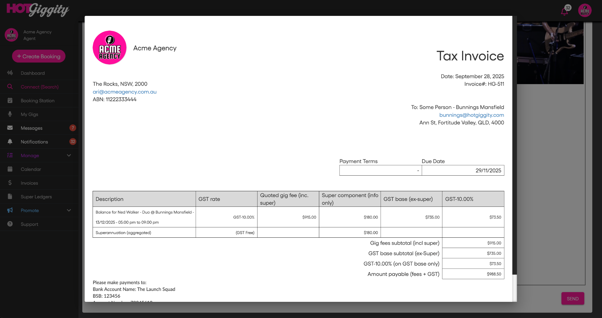 This article explains how Hot Giggity handles Superannuation Guarantee (SG) for Private Function bookings when the act owner is a sole trader (so SG applies). It also shows how the deposit and balance invoices are generated and where the GST-free super line appears.