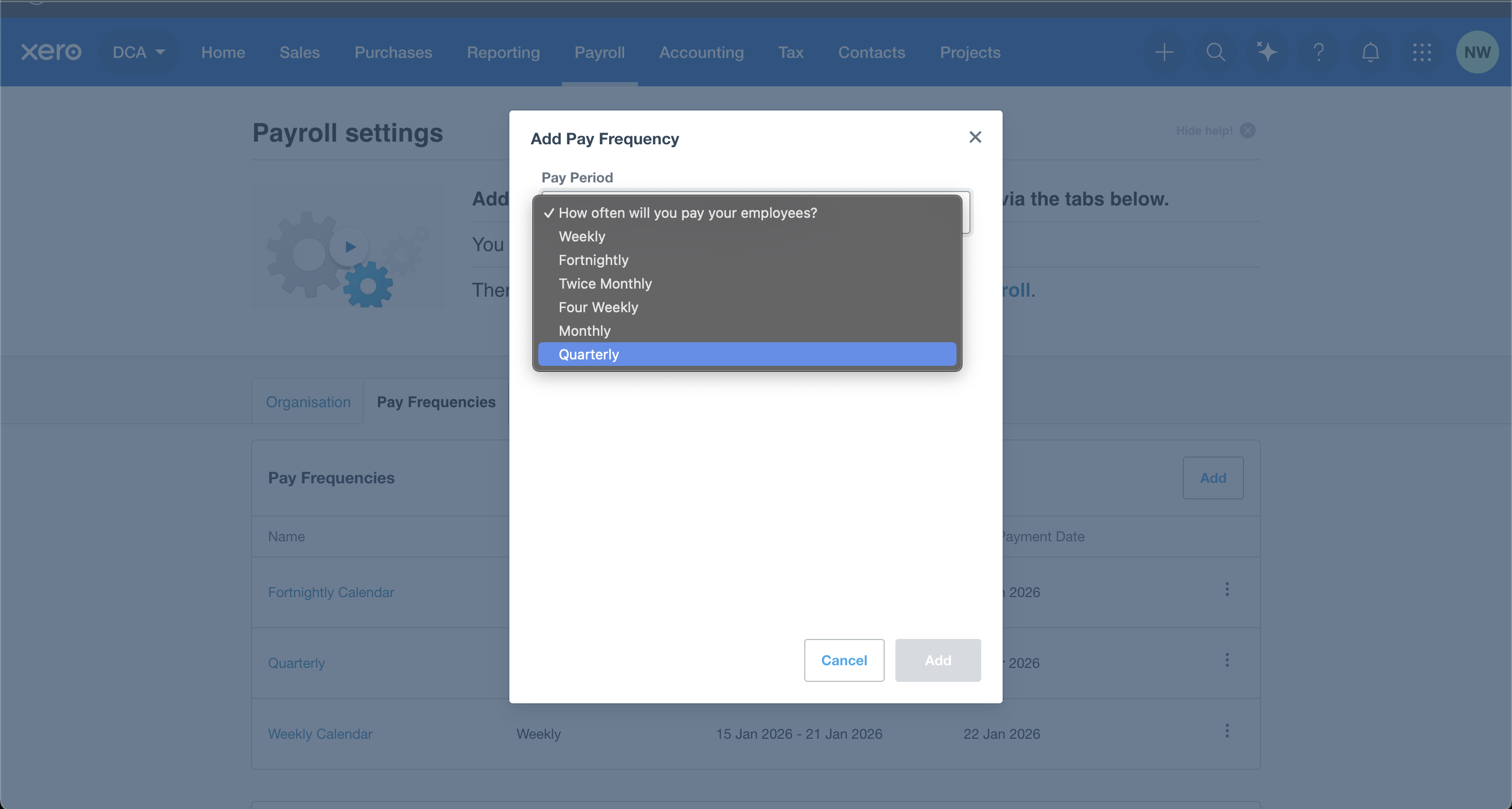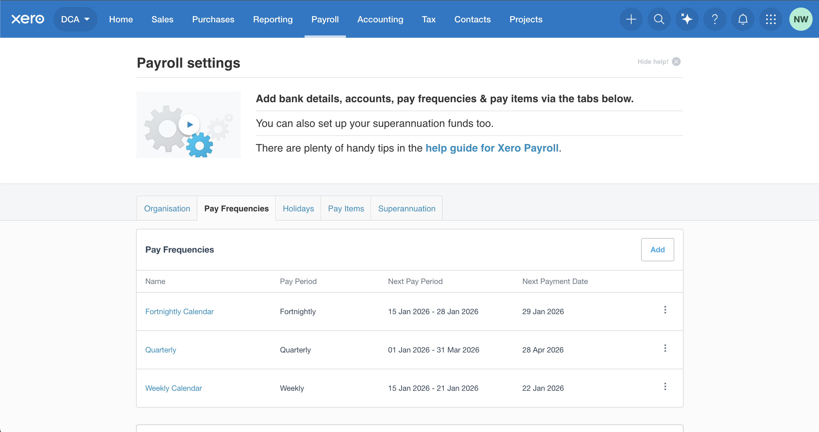 Click Pay Calendars (or Pay Frequencies, depending on your Xero view)