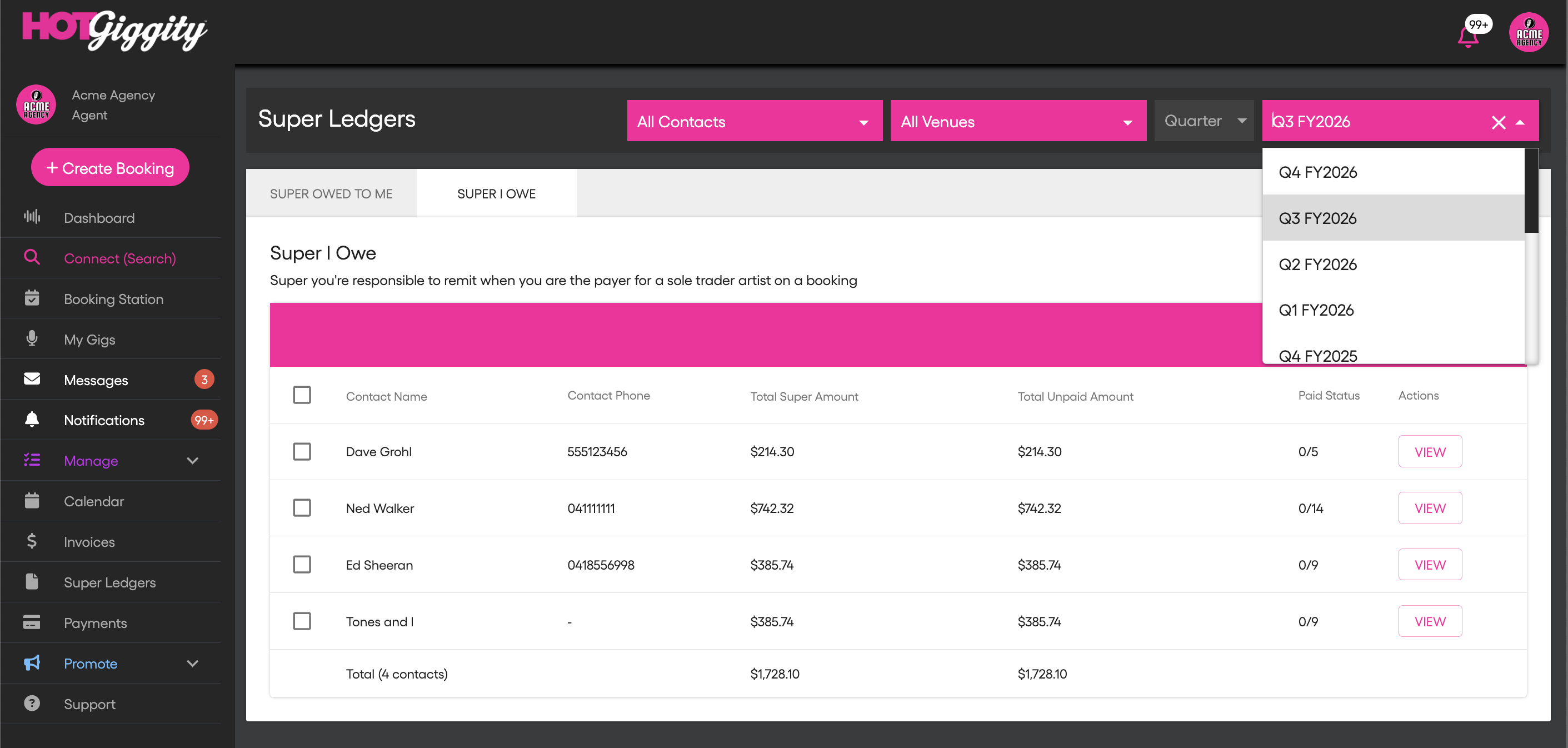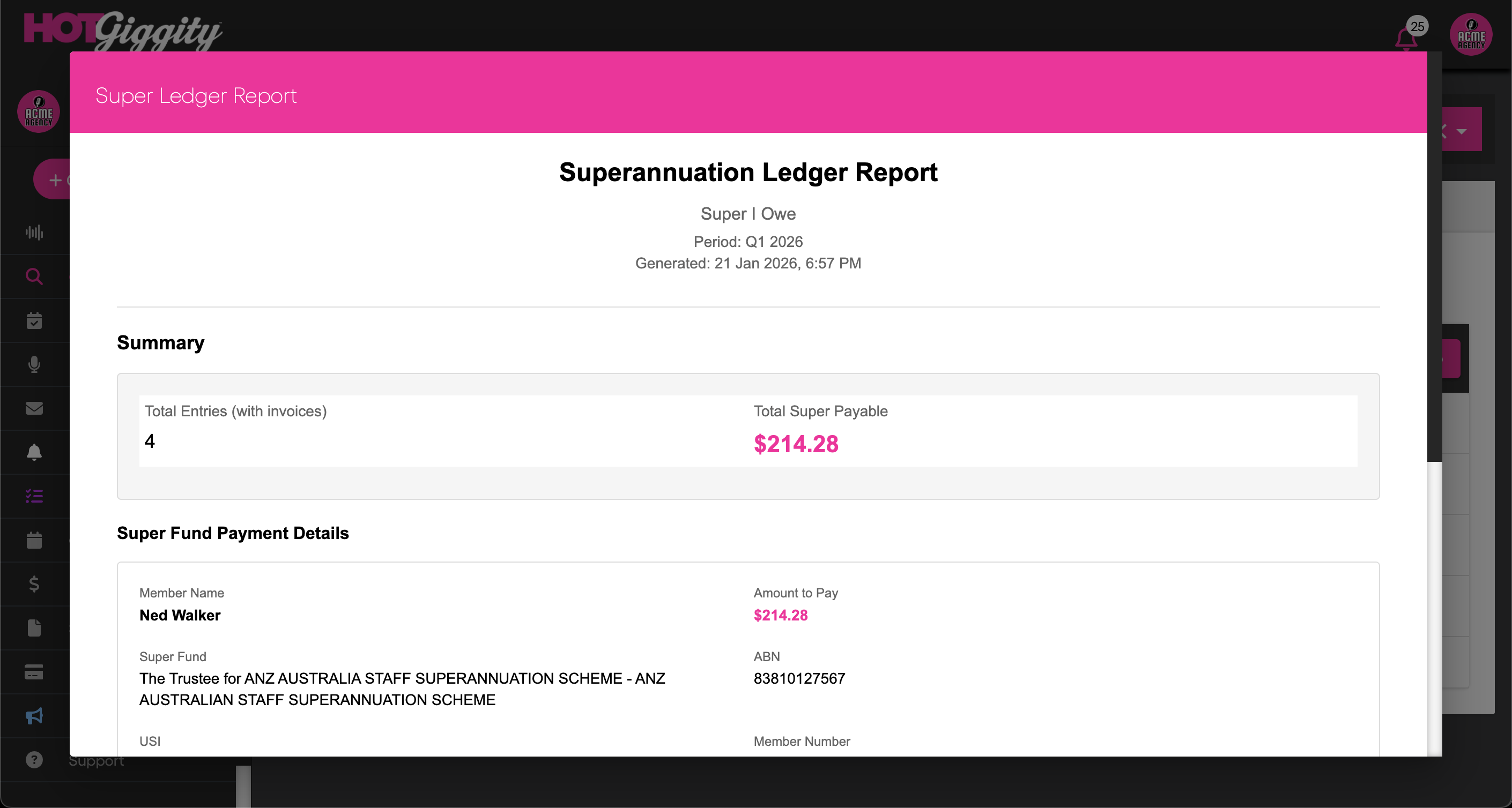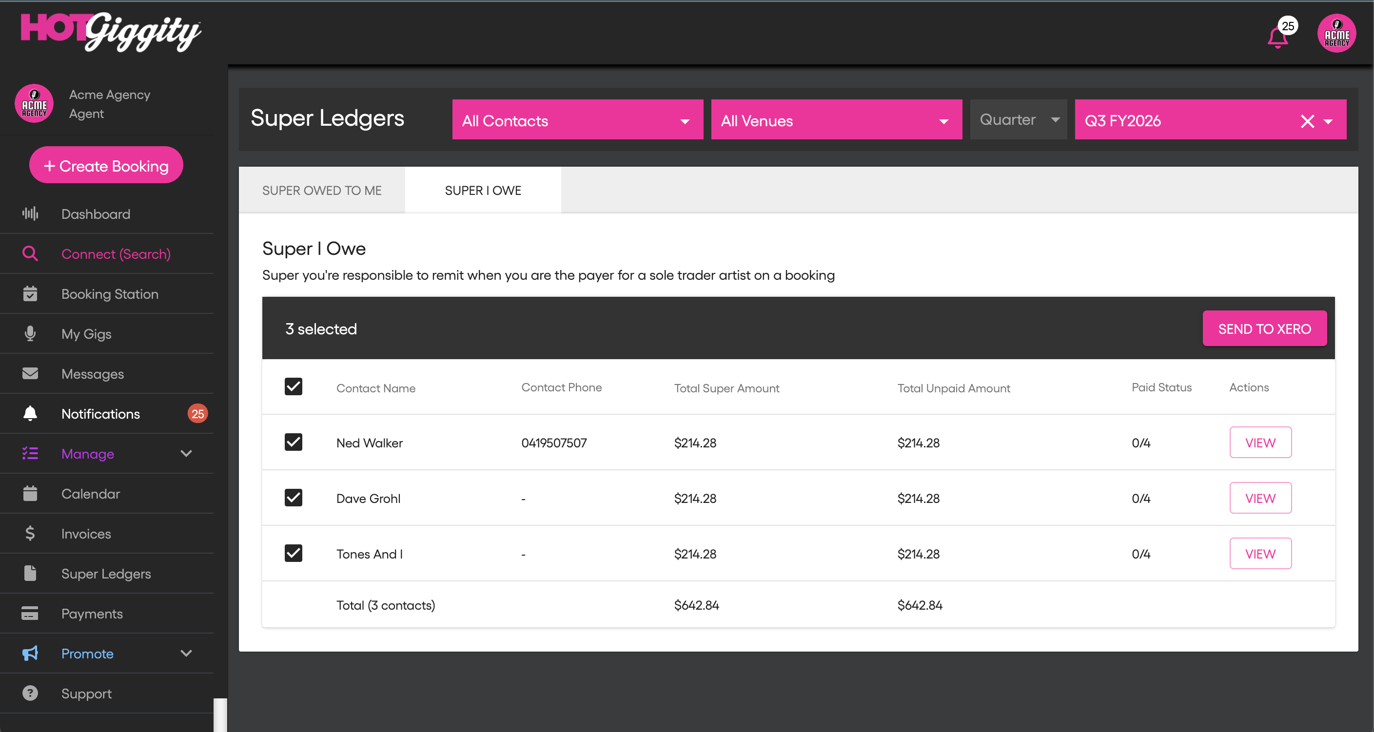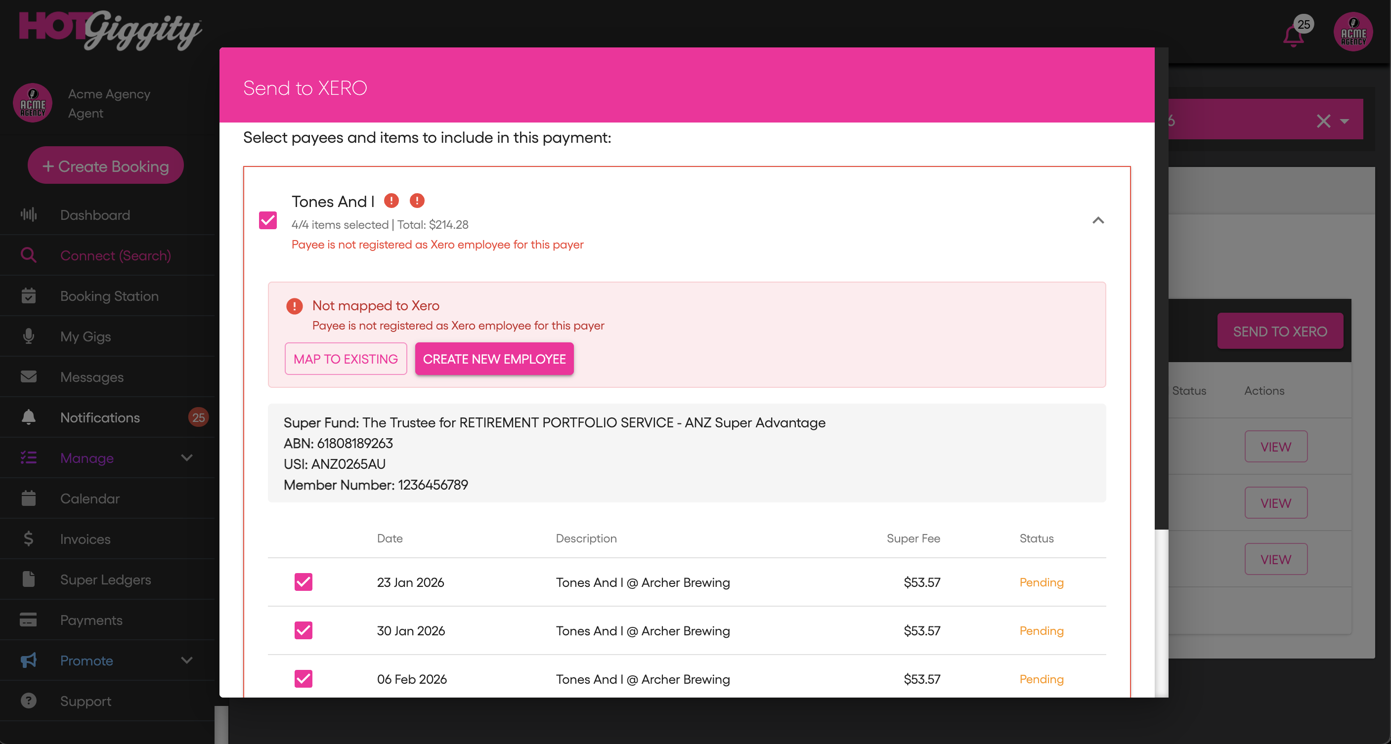 Confirm the musician has completed their super details in Hot Giggity (fund name, member number, ABN/USI, and TFN). You can check this via Manage → My Acts — the Super Details column should show a green tick.