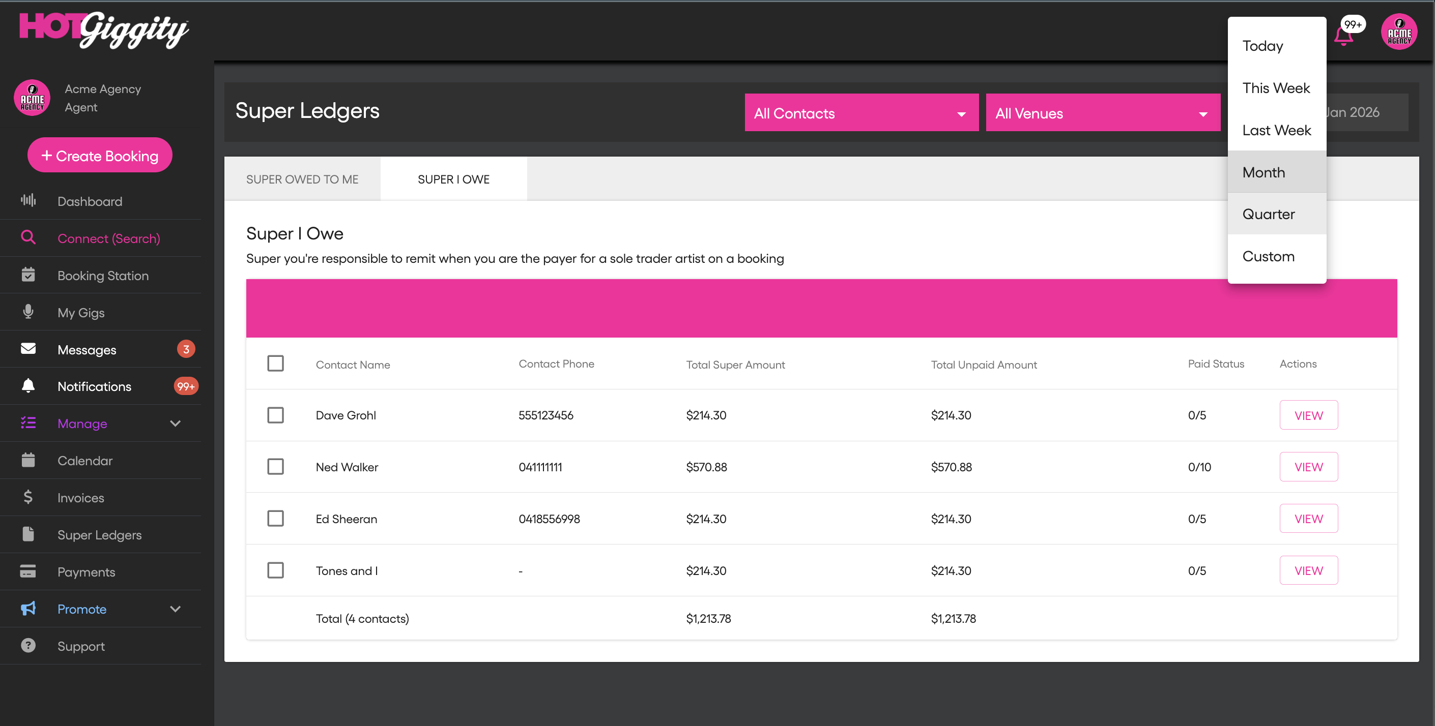 Click View next to an artist to open a Super Ledger Report, showing: