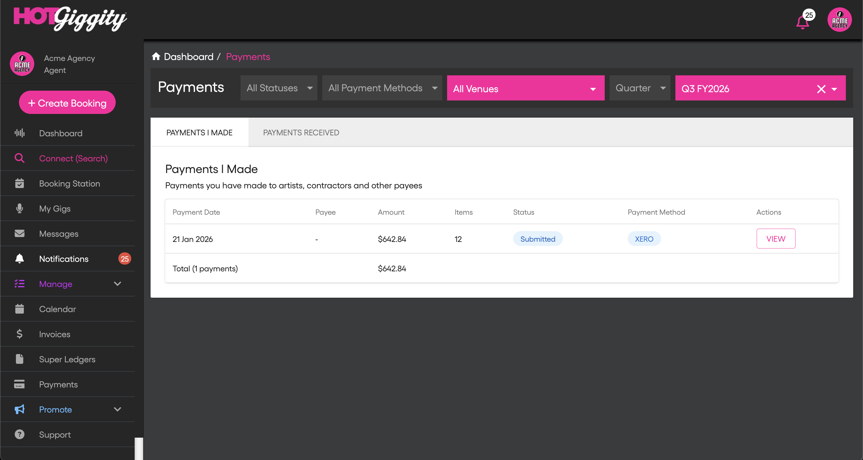 Pending (payment created in Hot Giggity) → Submitted (sent to clearing XERO pay run - status draft) → Posted (pay run posted in Xero) → Settled (manually marked as paid)