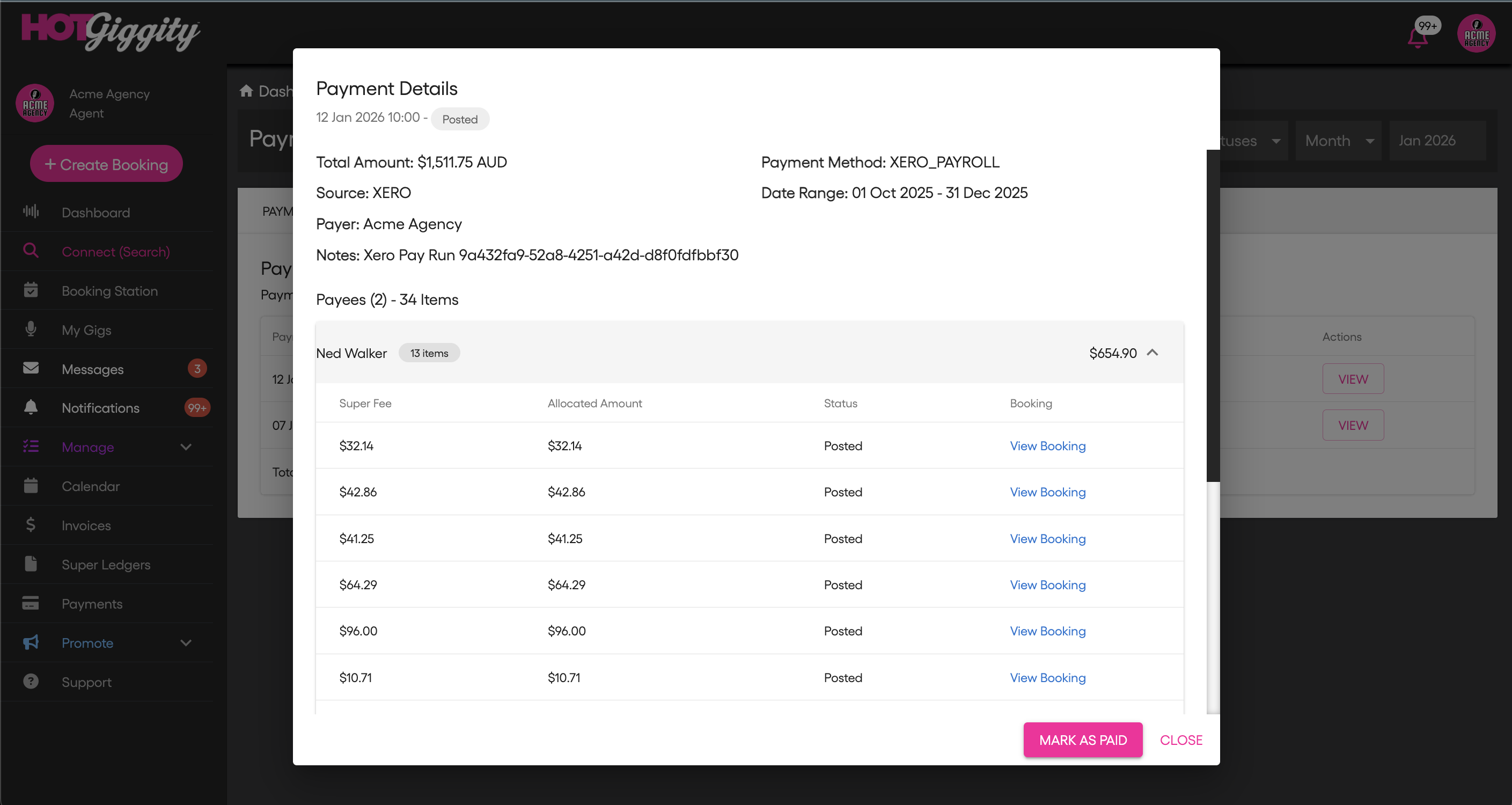 This will update all artist super payments, and super ledger items as Paid. A notification will be sent to artists and their super ledger status will update accordingly.